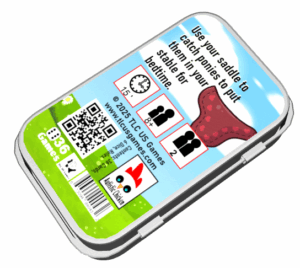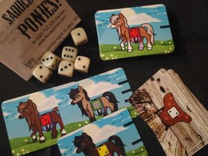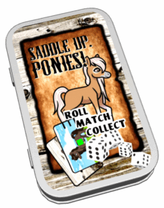 Roll dice to match the die on the pony card to catch ponies and earn happiness. Get extra happiness when the die on your saddle card matches the die on the pony card.